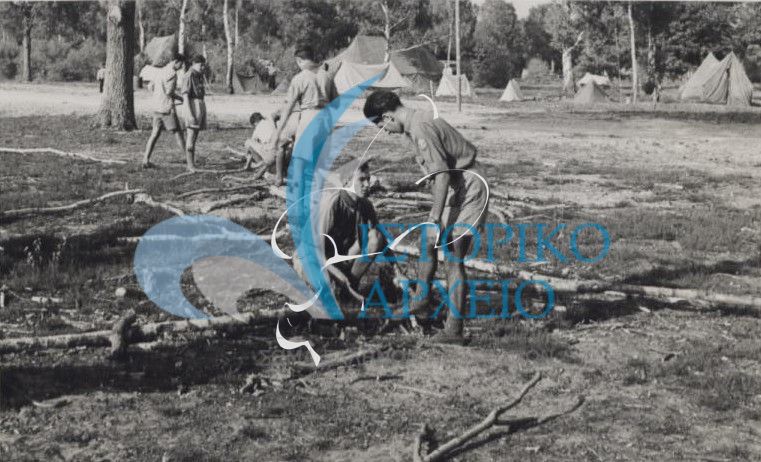 Έλληνες πρόσκοποι στην κατασκευή της κατασκήνωσής τους στο Τζάμπορη της Γαλλίας το 1947.