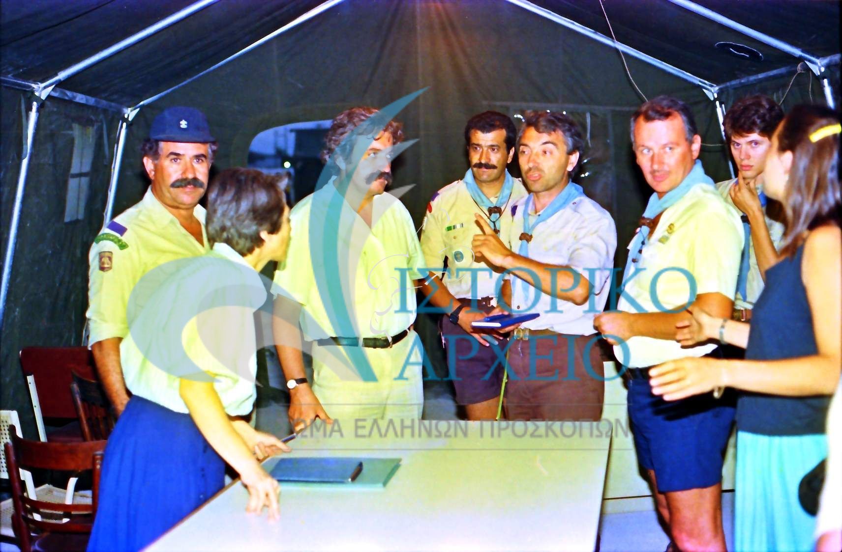 Ο Δήμαρχος Καλαμάτας Στ. Μπάνος μαζί με εκπροσώπους του ΣΕΠ συντονίζουν την προσφορά στους σεισμοπαθείς της περιοχής το 1986. Διακρίνονται οι: Γ. Τσαντίλης, Ν. Χουντάλας ΕΠ Πελοποννήσου, Απ. Λαμπρινόπουλος ΤΕ Καλαμάτας