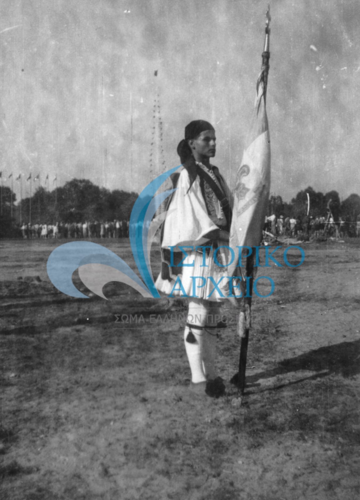 Ο Κωνσταντίνος Ζέπος σημαιοφόρος της ελληνικής προσκοπική αποστολής στο Τζάμπορη της Γαλλίας το 1947.