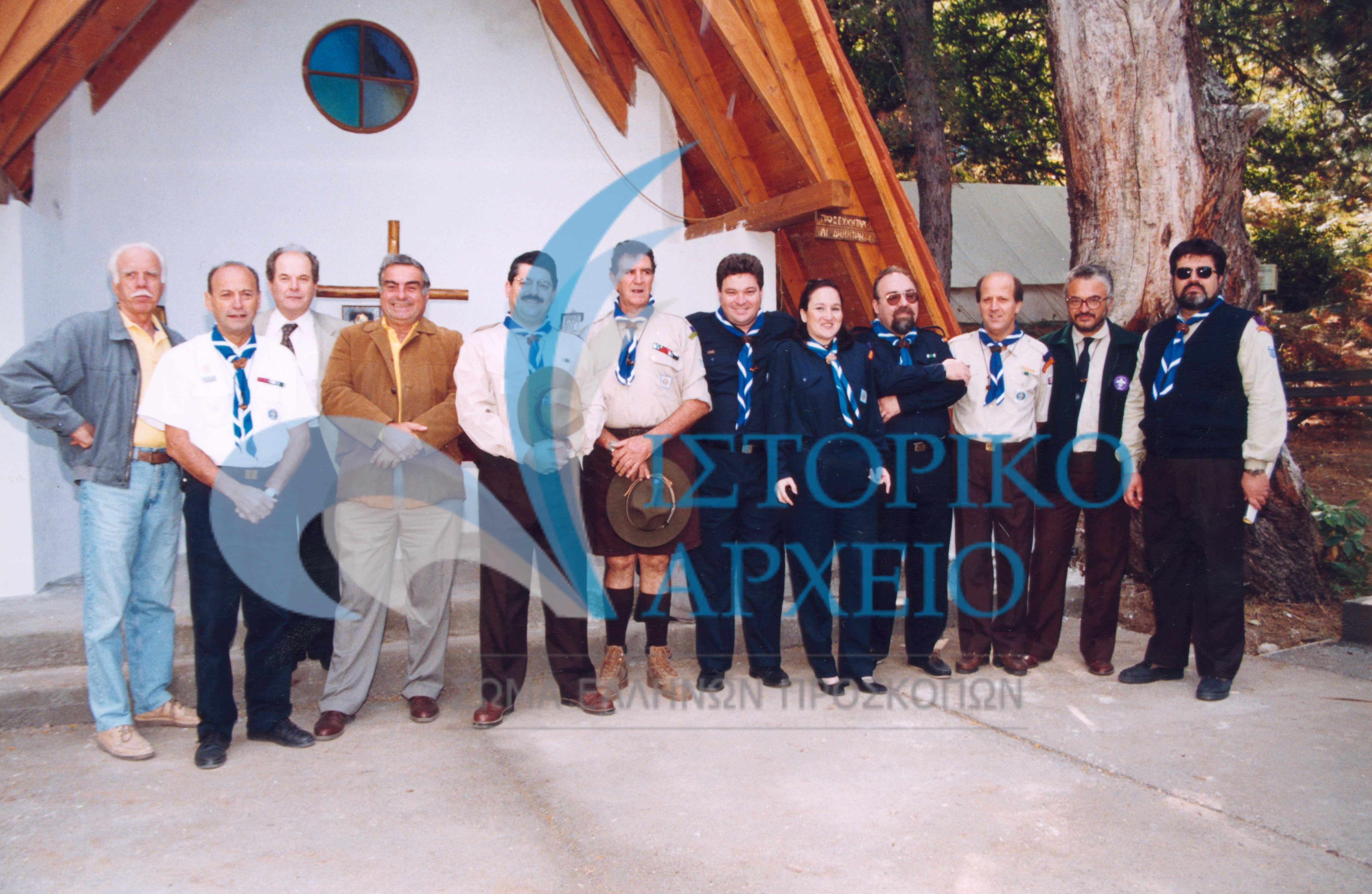 Στιγμιότυπο μετά τα εγκαίνια του ανακαινισμένου Κατασκηνωτικού Κέντρου "Θ. Λίτσα" στον Χορτιάτη Θεσσαλονίκης. Διακρίνεται ο ΕΠ Μακεδονίας - Θράκης Γ. Πουρνάρης και μέλη Ενώσεων Παλαιών Προσκόπων.